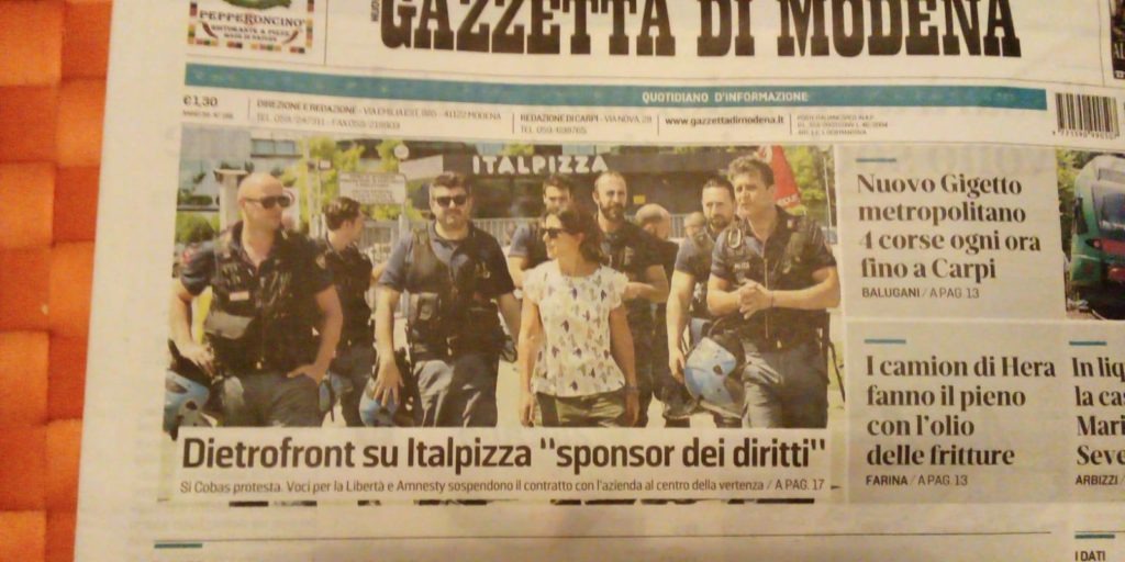 Verrebbe da chiedersi se i signori di Italpizza hanno messo al corrente di questa loro sponsorizzazione i loro amici del SAP e del SIULP di Modena, ovvero quelle rappresentanze delle forze dell’ordine che hanno rivendicato i pestaggi fuori ai loro cancelli e che da anni tuonano contro ogni proposta tesa a rendere il loro operato trasparente e i loro abusi identificabili…