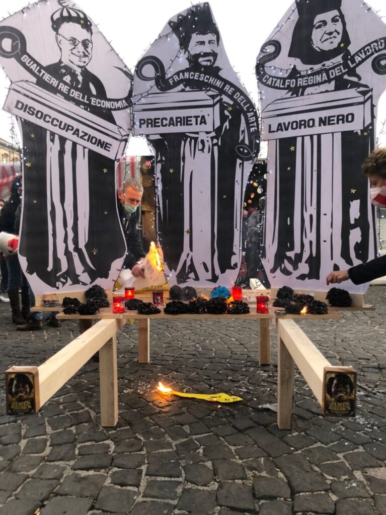 Lavoratori dello spettacolo, disoccupati, precari, docenti, tutti uniti dal far parte di una stessa categoria: lavoratori e lavoratrici combattivi e in lotta.