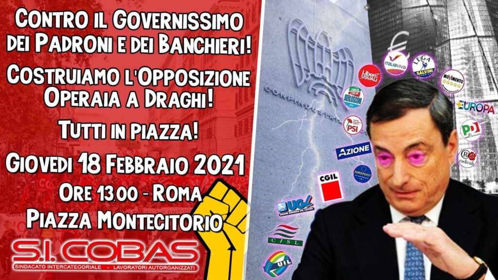 Abbiamo il dovere di riaffermare, qui ed ora, che il governo-Draghi pur godendo di una maggioranza bulgara in parlamento, troverà sulla sua strada le migliaia di lavoratori del SI Cobas che in questi anni hanno lottato per riscattarsi dallo sfruttamento e dai salari da fame e che durante la fase pandemica hanno continuato a produrre e a morire in nome dei profitti, ma anche a difendere i propri diritti e le proprie conquiste come dimostra la lotta esemplare alla TNT- FedEx di Piacenza.