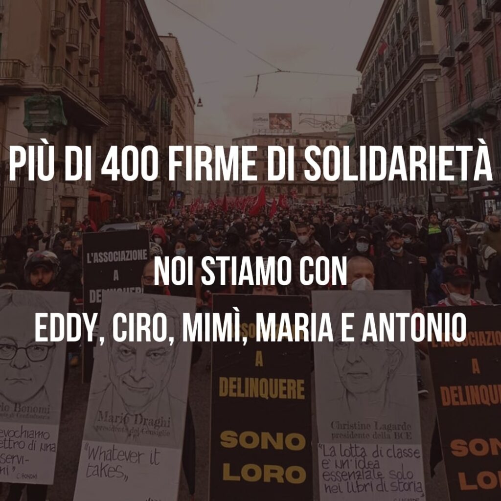 L’appello lanciato qualche settimana fa dal Laboratorio politico Iskra in solidarietà con i cinque militanti di classe napoletani colpiti da “avviso orale” emessi dalla questura di Napoli, ha raccolto un’ampia e forte solidarietà in Italia e nel mondo, come prova questa lista di adesioni che fa seguito ad una precedente pronuncia di organismi politici e sindacali.