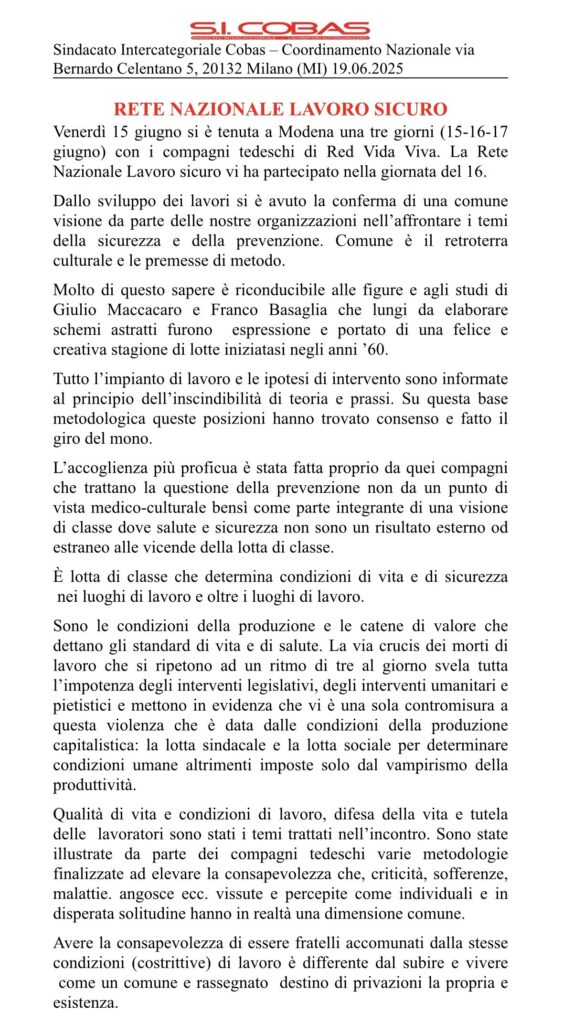 Venerdì 15 maggio si è tenuta a Modena una tre giorni (15-16-17 maggio) con i compagni tedeschi di Red Vida Viva. La Rete Nazionale Lavoro sicuro vi ha partecipato nella giornata del 16.